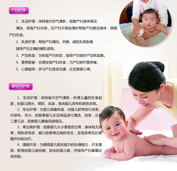 1、产妇护理:生活护理、乳房护理、产后恢复、营养配餐、心理指导等