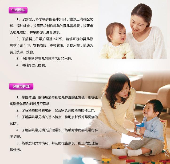 除要完成初、中级婴幼儿护理人员的工作外,还应该做到: 1.给婴幼儿开展启蒙训练。为新生儿提供早期智力开发和启蒙训练,培养良好的生活卫生习惯; 2.使用普通话与婴幼儿进行语言交流、给婴幼儿讲故事、说儿歌,陪婴儿玩游戏等。 |